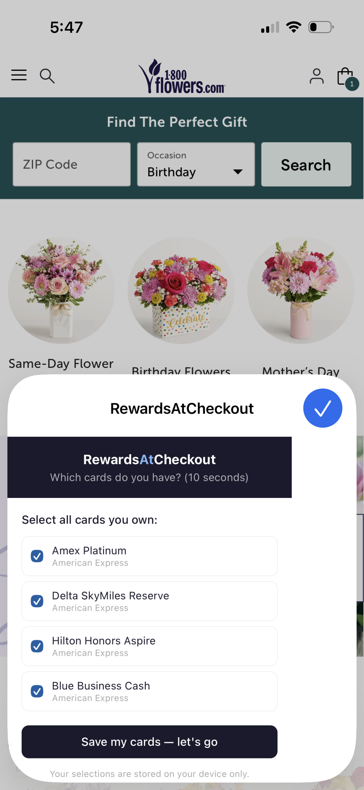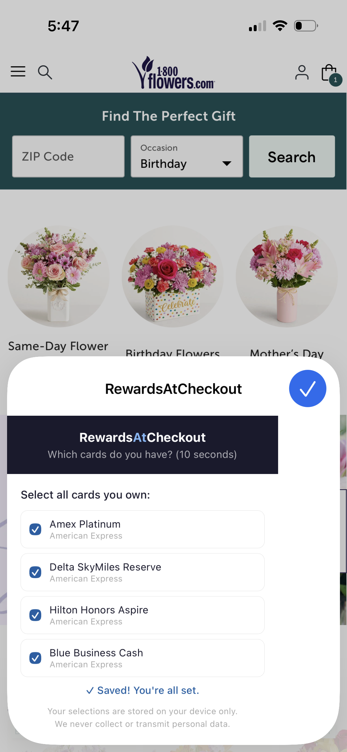 RewardsAtCheckout is free, private, and takes about 60 seconds* to set up.
